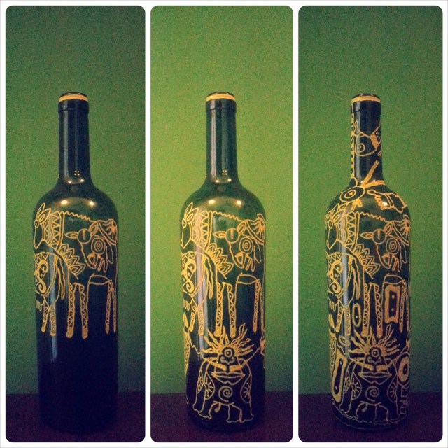 one of the new experiments , wine bottle art. I started collecting old wine bottles , scrubbing and cleaning them and then sketching on them and lighting them with led lights 🙂