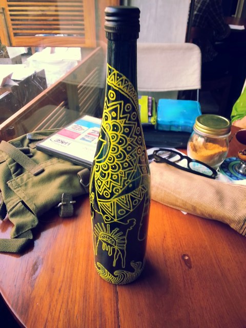 me working on a wine bottle in Art mela held in Bird song cafe in Jan 2014