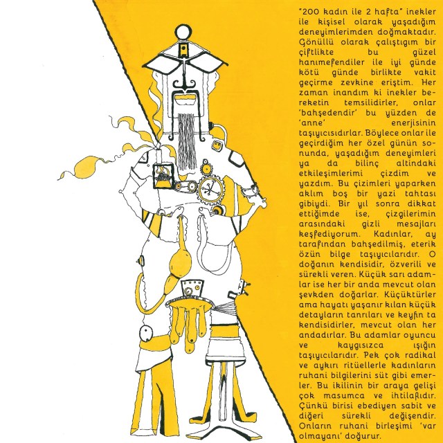 “2 WEEKS WITH 200 WOMEN”, is my personal interactions with cows. as a volunteer in an organic dairy farm last year I had the joy of interacting with these beautiful women through their ups and downs.I always believed that cows represent abundance, they are the givers and hence represent mother’s energy. Every evening after the days work i would sketch and write down one experience or sub conscious interaction i had on that particular day. My mind was a blank slate when i was making these sketches. After one year when i notice them i am discovering messages hidden between my lines. Women are the wise carrier of ethereal nectar gifted to them by the moon , she is the nature herself selfless and ever giving . The little yellow men were born out of desire that exists in each and every moment. As little as they are, they make life worth it, they are the god of small things, they are the joy that exists in every moment. These men are the carriers of light playful and carefree.They milk the women to gain their spiritual knowledge through many radical and unorthodox rituals. The coming together of the two is very innocently controversial because one is forever constant and the other ever changing. Their psychic union gives birth to that which is not.